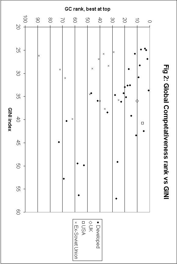 Another figure compiled by the UN is the "Global Competitiveness" which is based on a combination of economic factors. Figure 3 shows this plotted against Gini.
